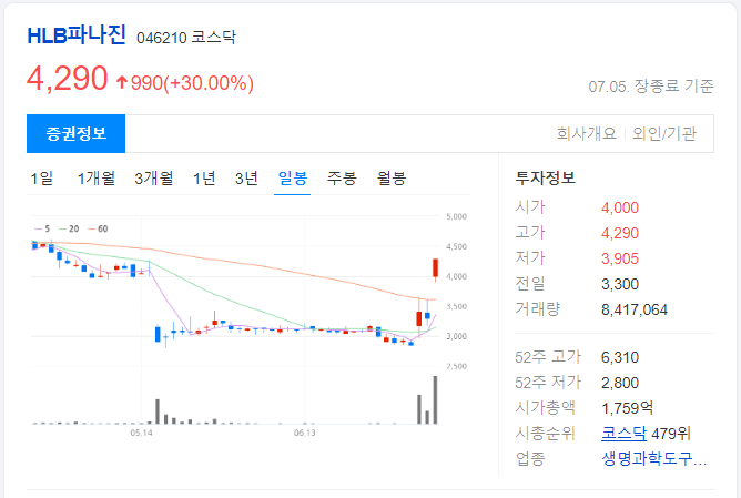 HLB파나진 4,920원 (↑30.00%)